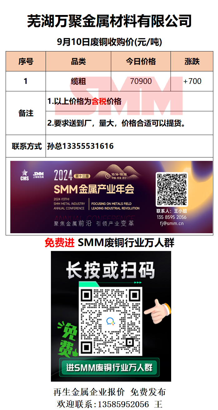 今日芜湖万聚金属 废铜采购报价已更新,有货的朋友欢迎联系我们!