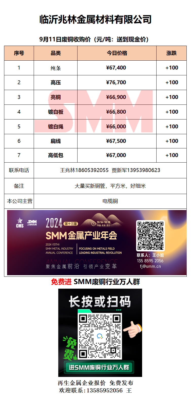 9月11日临沂兆林金属 废铜采购报价