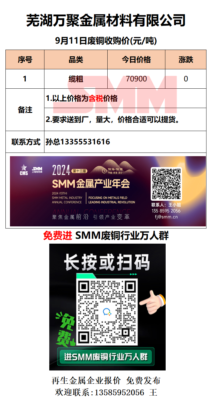 今日芜湖万聚金属 废铜采购报价已更新,有货的朋友欢迎联系我们!