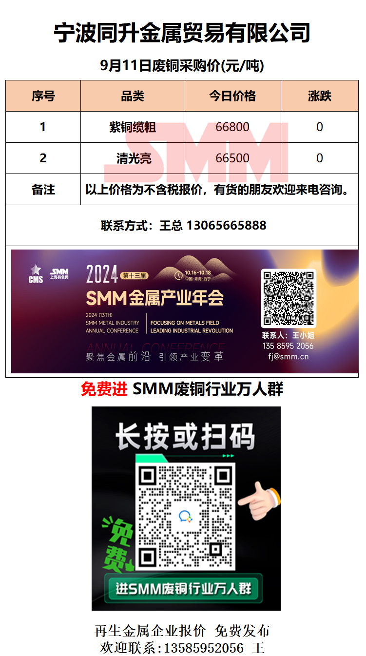 9月11日同升金属 废铜采购报价