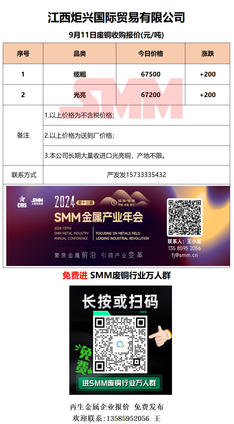 今日江西炬兴 废铜采购报价已更新,有货的朋友欢迎联系我们!