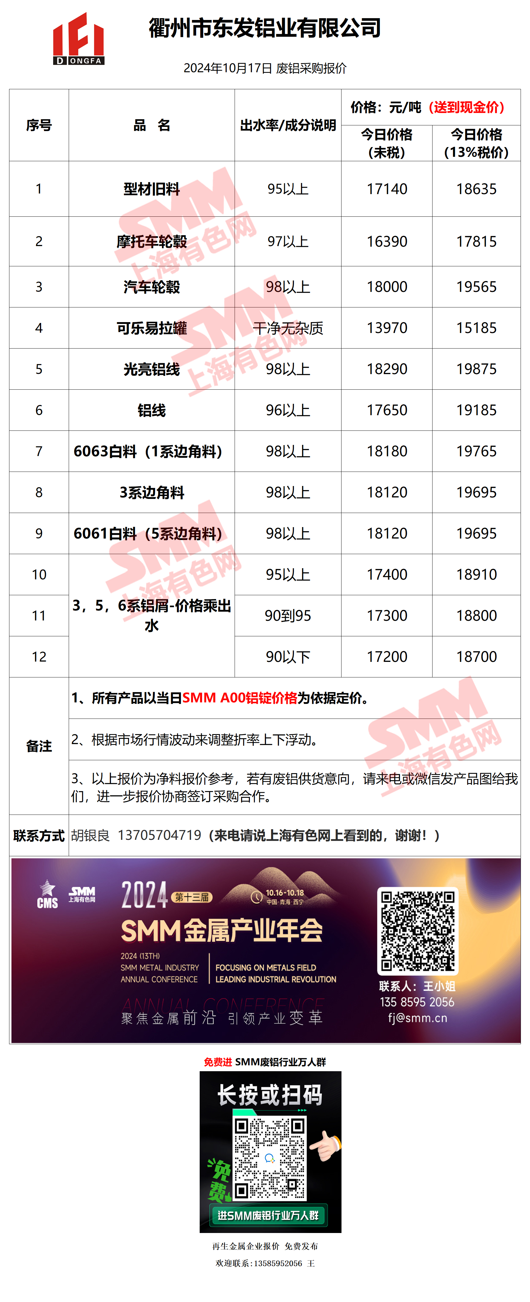 10月17日衢州东发 废铝采购报价