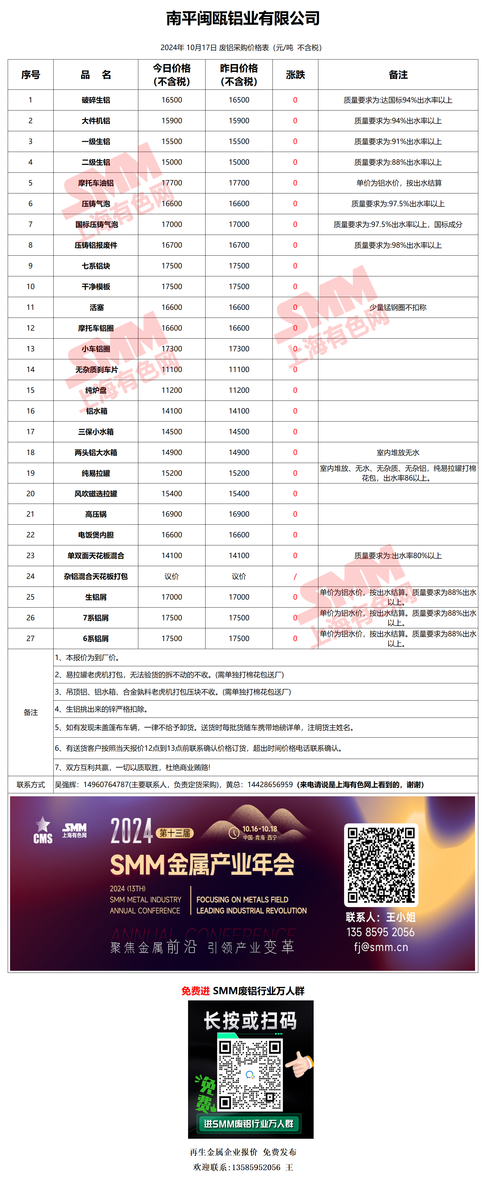 10月17日南平闽瓯 废铝采购报价