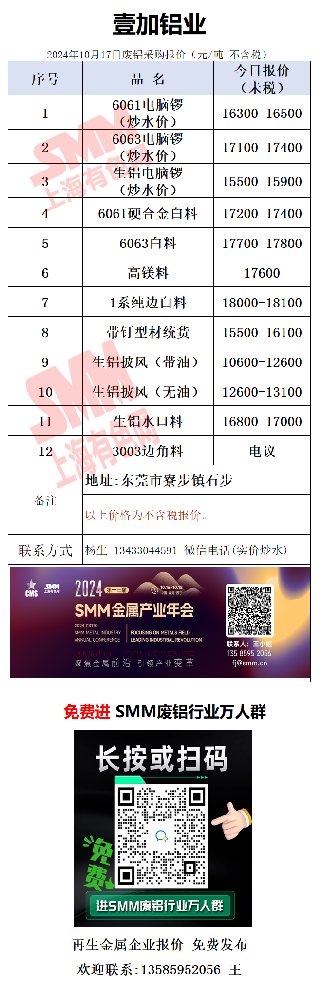 今日壹加铝业 废铝采购报价已更新,有货的朋友欢迎联系我们!