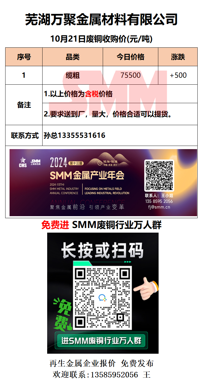 10月21日芜湖万聚金属 废铜采购报价