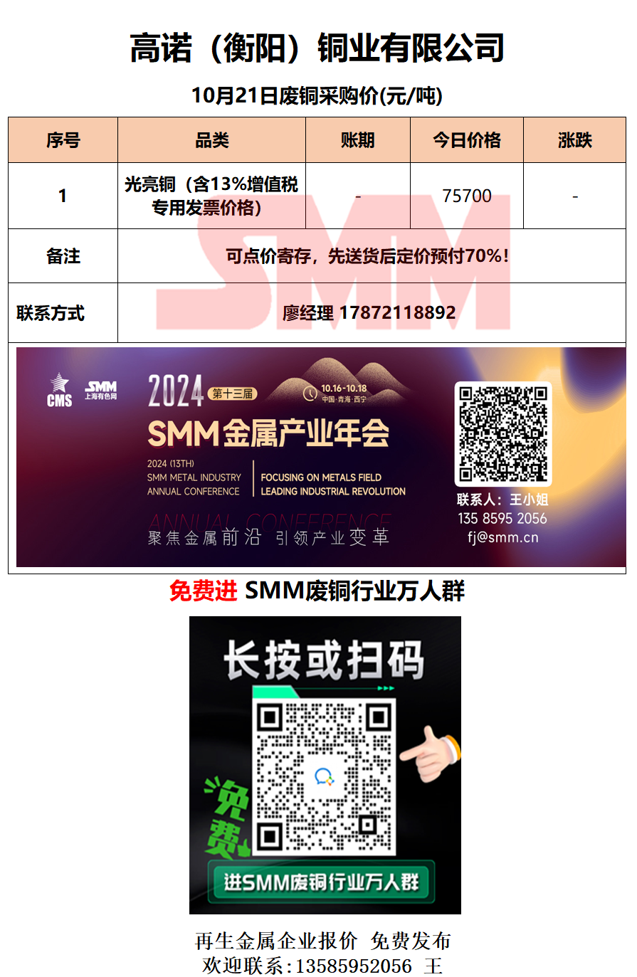 10月21日高诺(衡阳)铜业 废铜采购报价