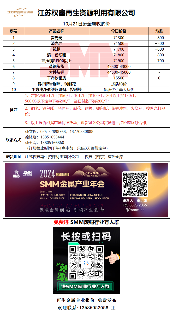 今日江苏权鑫 废铜采购报价已更新,有货的朋友欢迎联系我们!