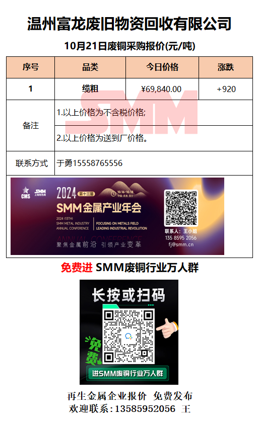 10月21日温州富龙废旧 废铜采购报价