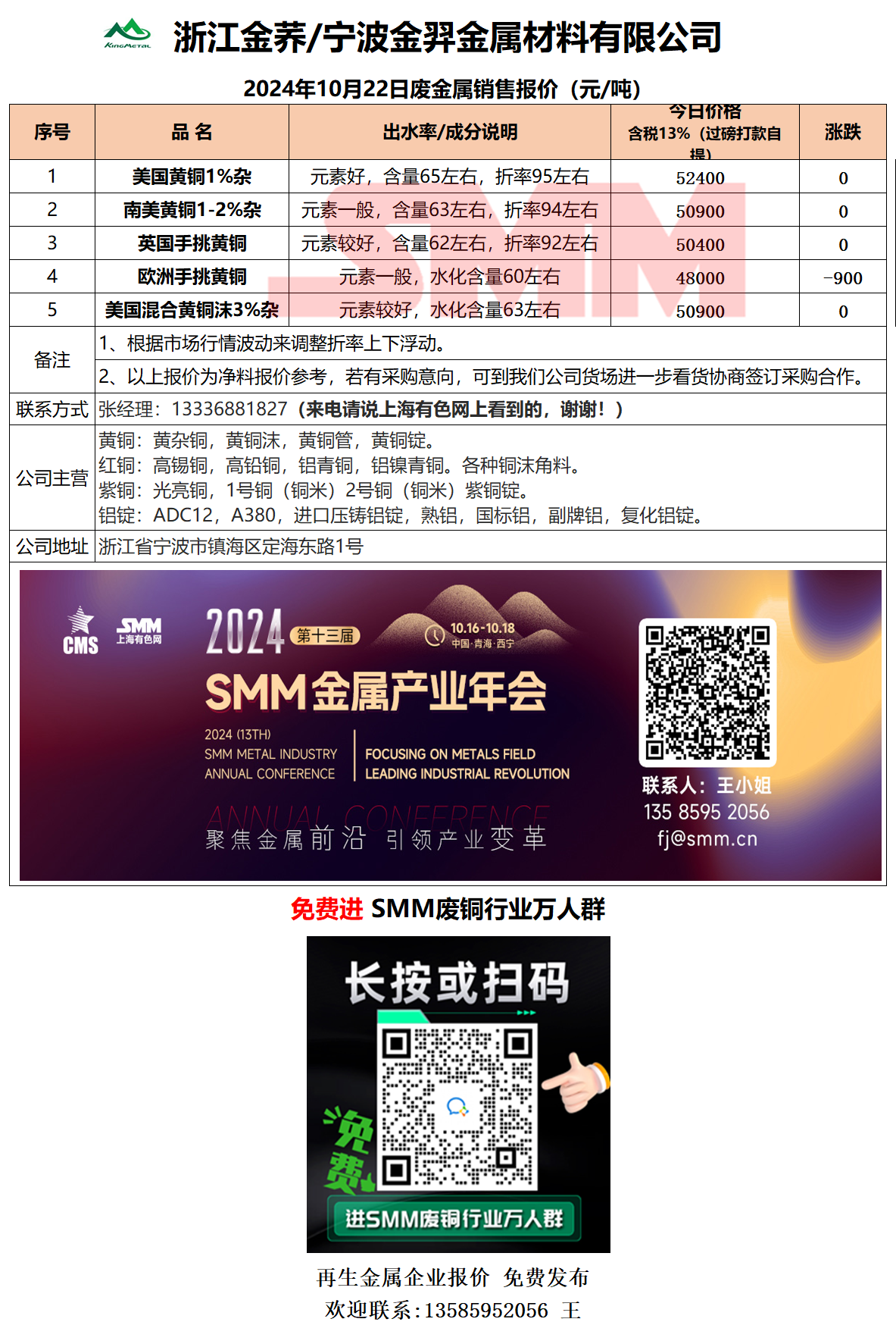 10月22日浙江金荞 宁波金羿 废铜采购报价