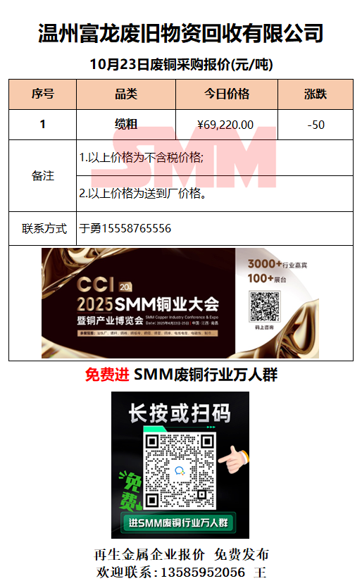 今日温州富龙废旧 废铜采购报价已更新,有货的朋友欢迎联系我们!
