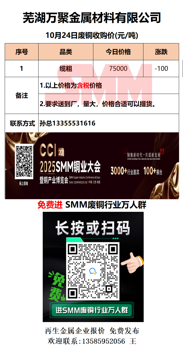 今日芜湖万聚金属 废铜采购报价已更新,有货的朋友欢迎联系我们!