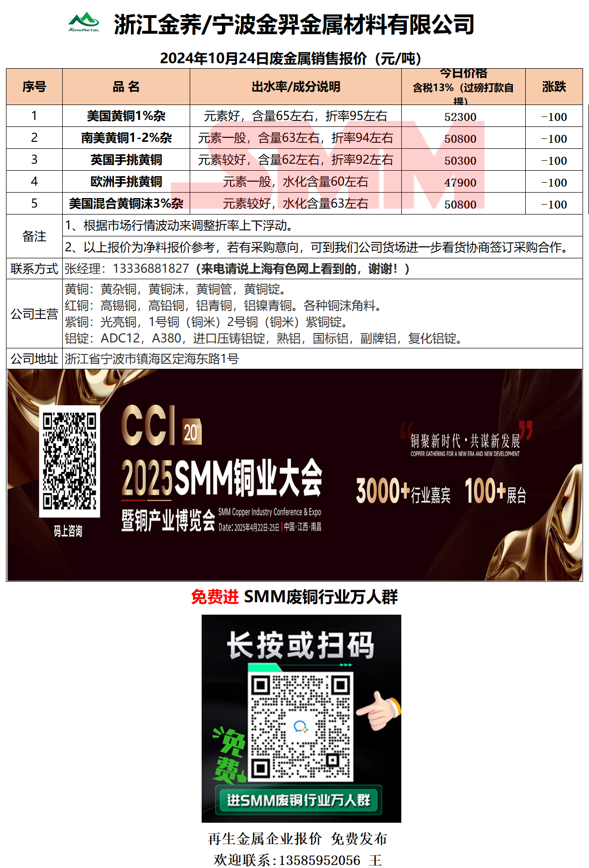 10月24日浙江金荞 宁波金羿 废铜采购报价