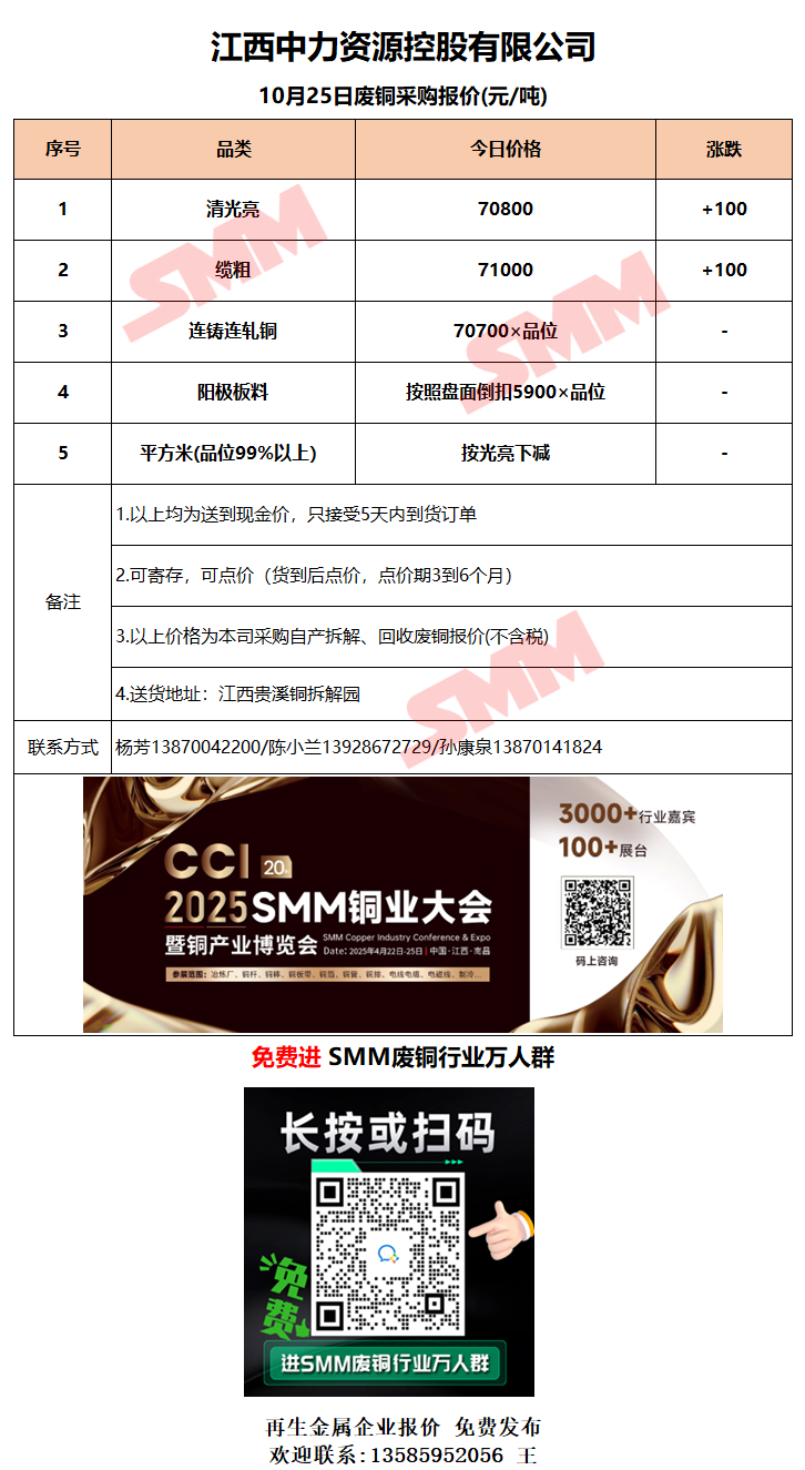 10月25日江西中力 废铜采购报价