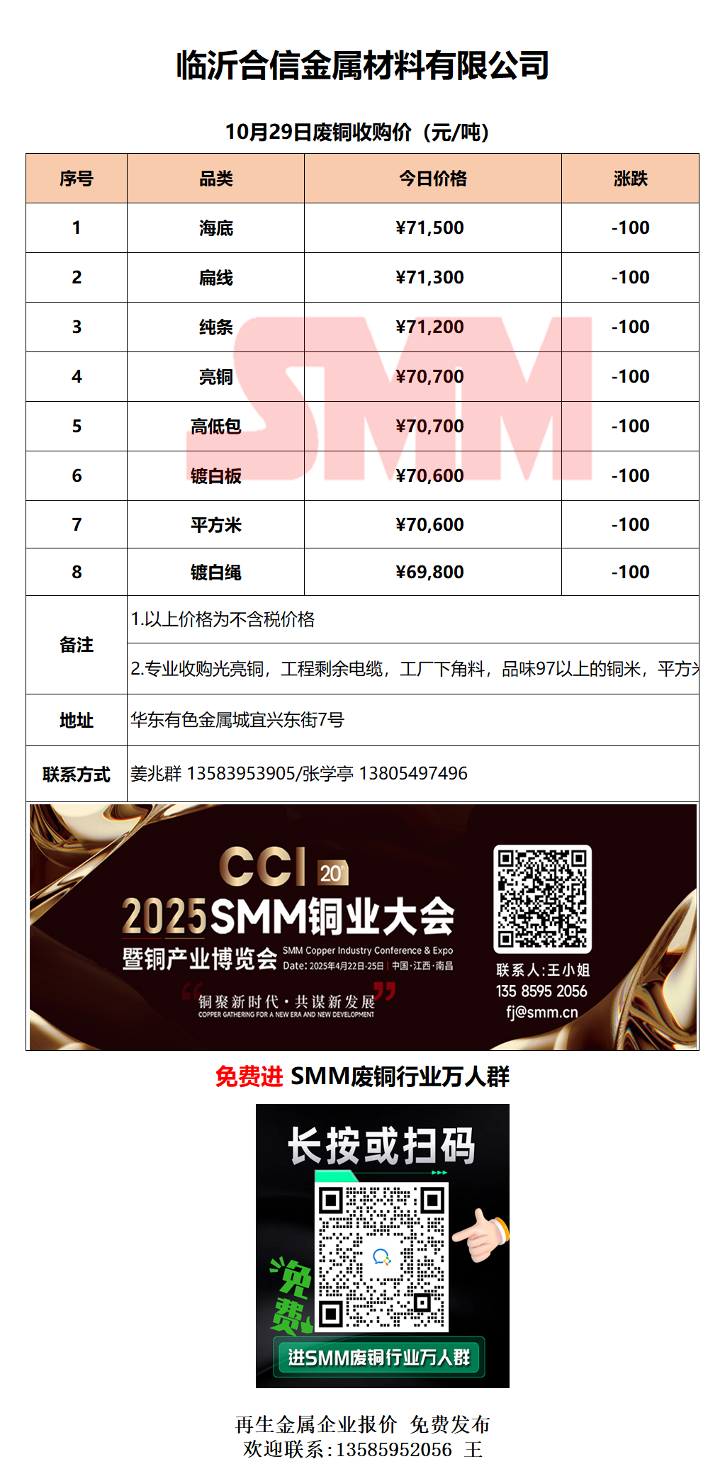10月29日临沂合信金属 废铜采购报价