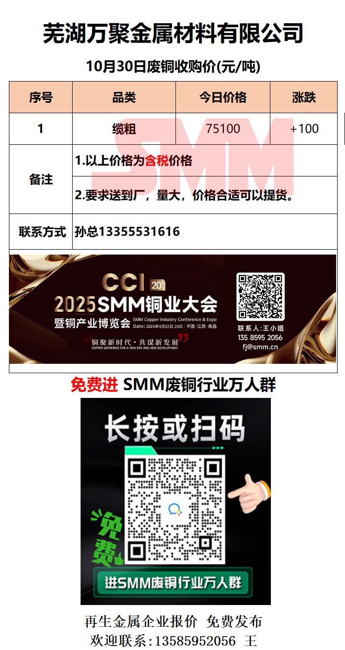 10月30日芜湖万聚金属 废铜采购报价