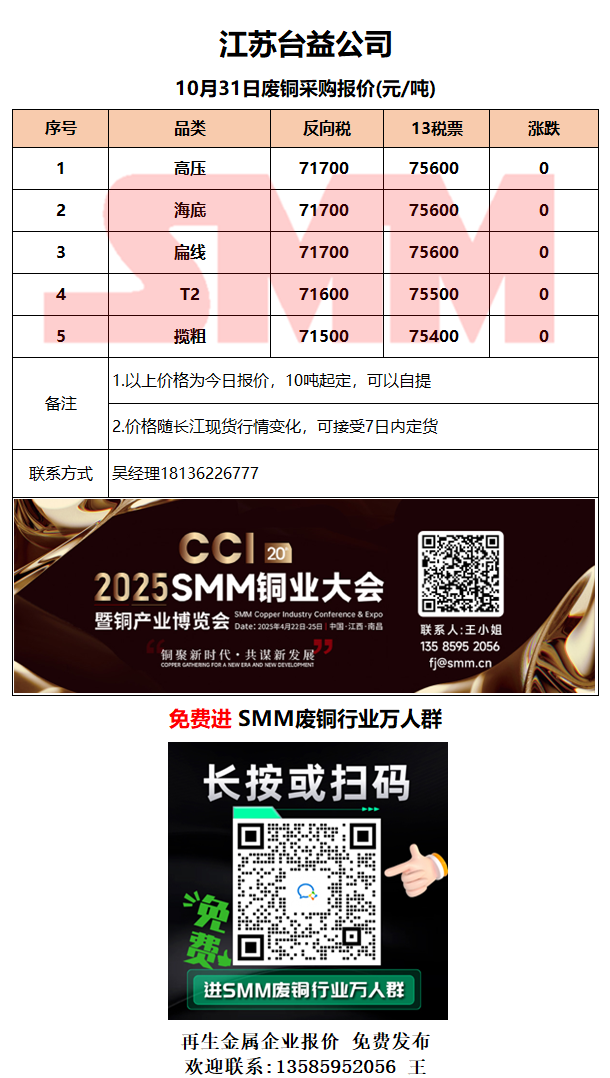 今日江苏台益 废铜采购报价已更新,有货的朋友欢迎联系我们!