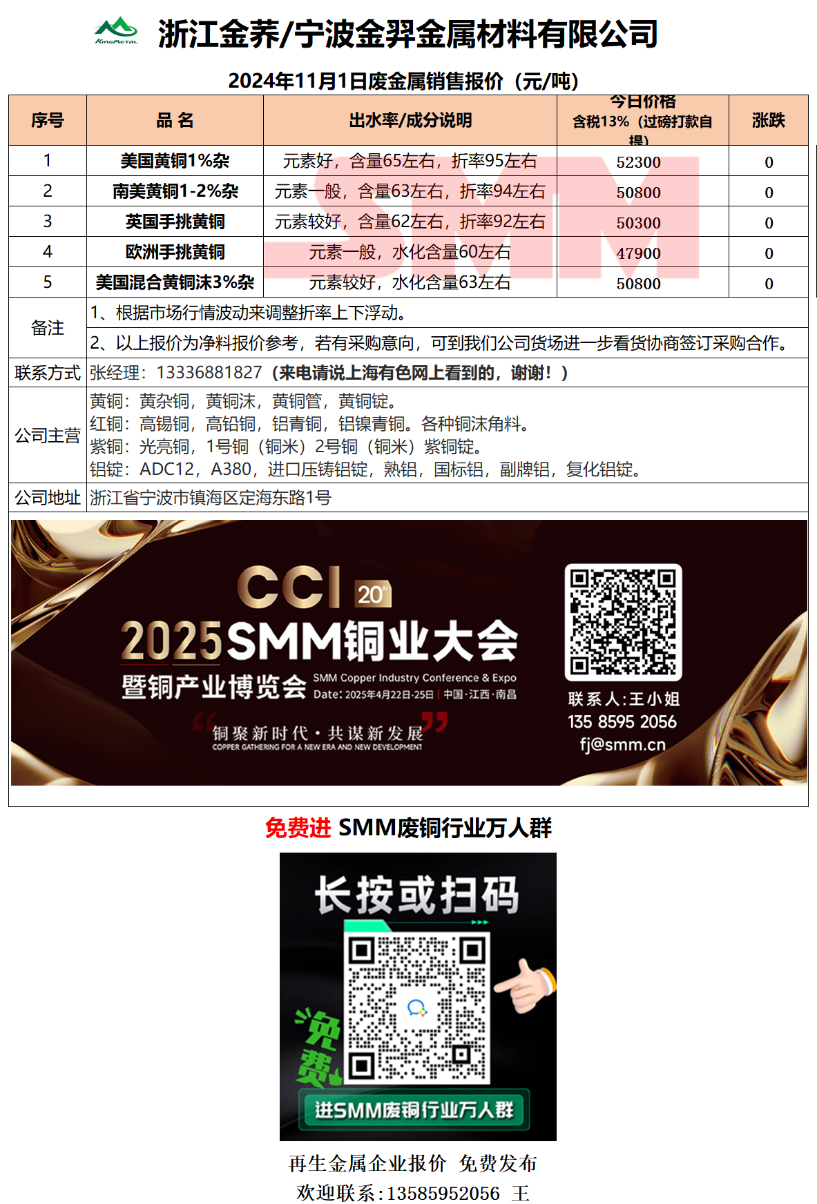 11月1日浙江金荞 宁波金羿 废铜销售报价