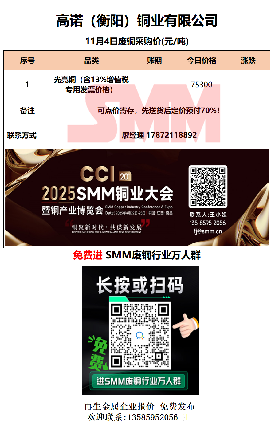 11月4日高诺(衡阳)铜业 废铜采购报价