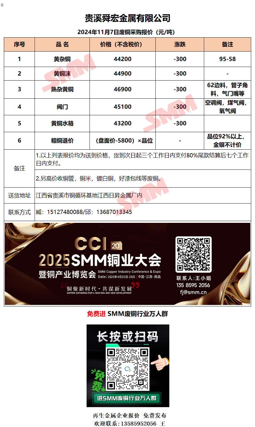 11月7日贵溪舜宏 废铜采购报价