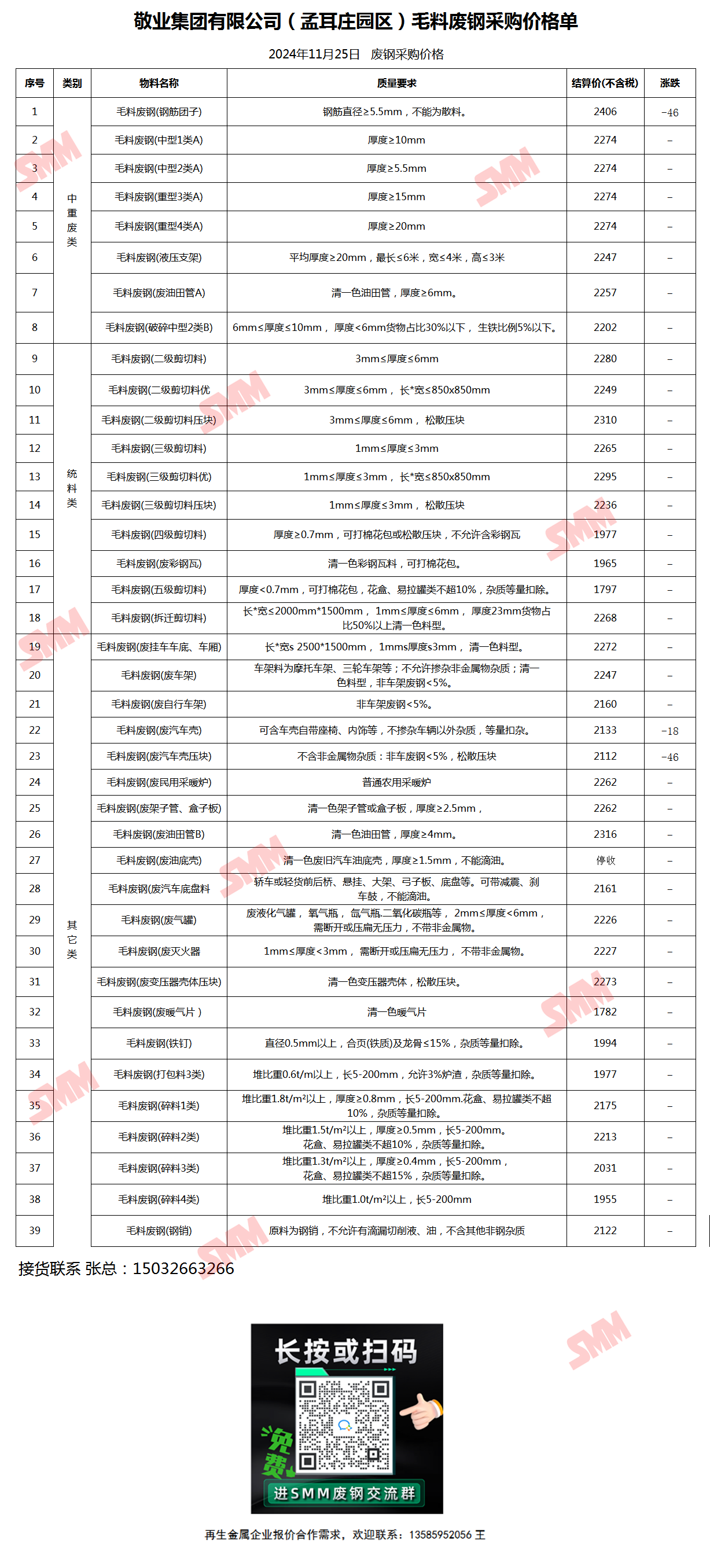 11月25日敬业钢铁(孟耳庄园区) 废钢采购报价