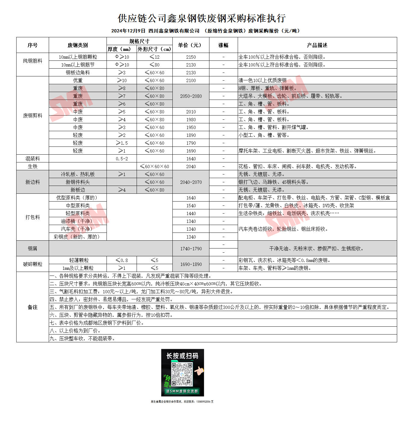 12月9日鑫泉钢铁(原绵竹金泉钢铁) 废钢采购报价