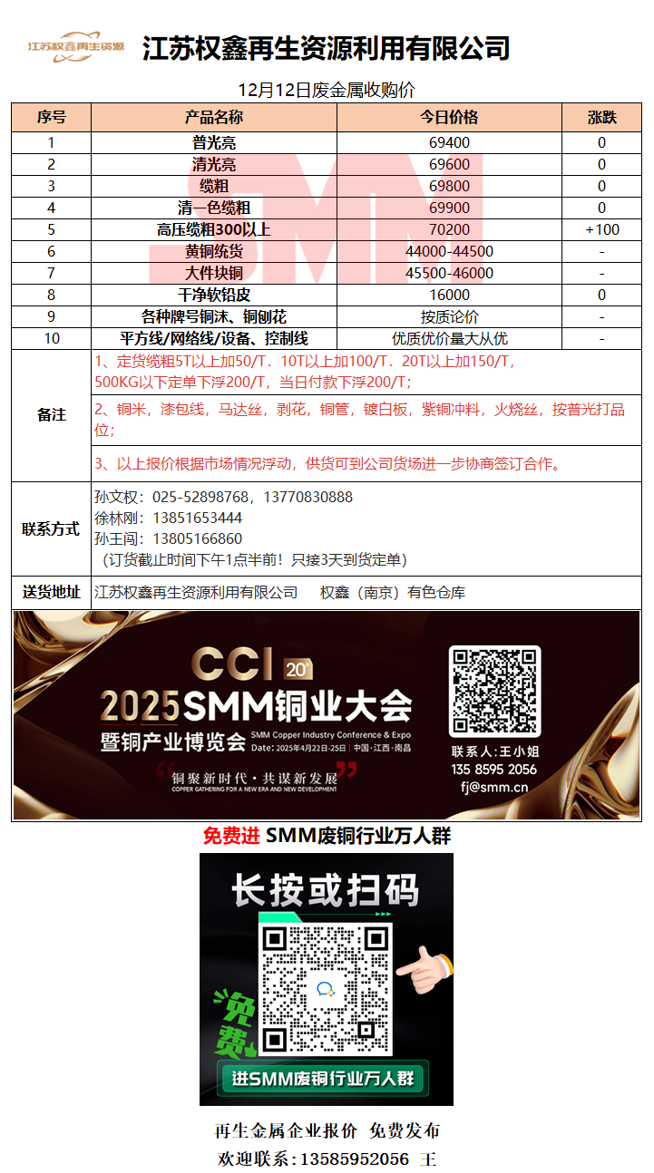 12月12日江苏权鑫 废铜采购报价