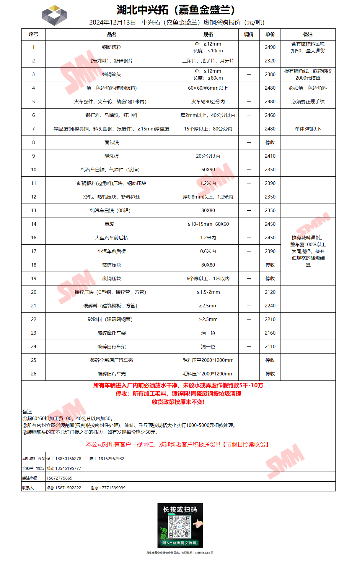 12月13日湖北中兴拓(嘉鱼金盛兰) 废钢采购报价