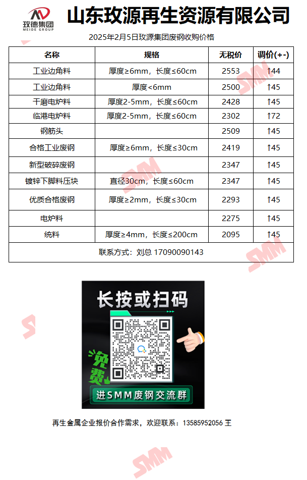 2月5日山东玫源再生 废钢收购报价