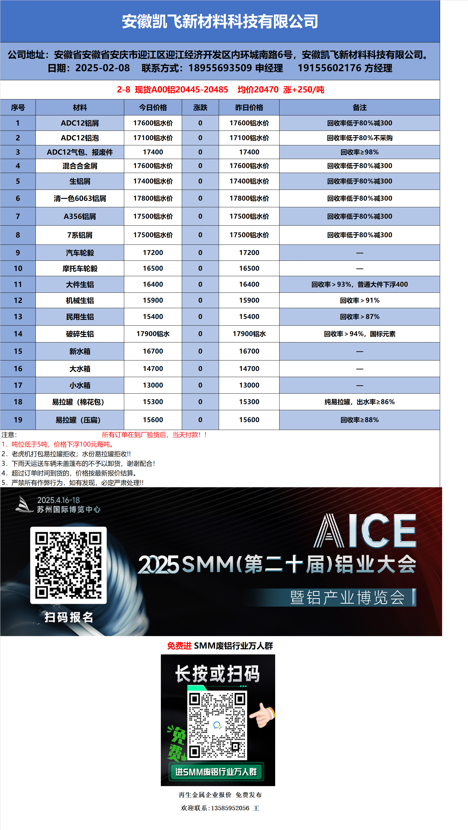 今日安徽凯飞 废铝采购报价已更新,有货的朋友欢迎联系我们!