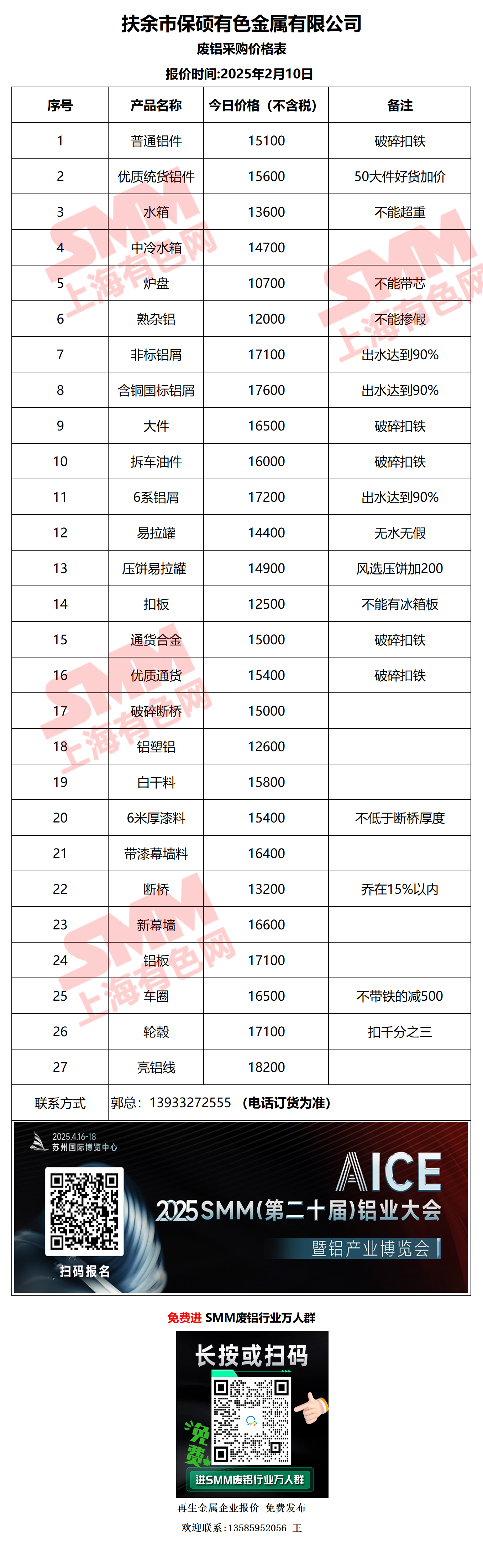 今日保硕金属 废铝采购报价已更新,有货的朋友欢迎联系我们!