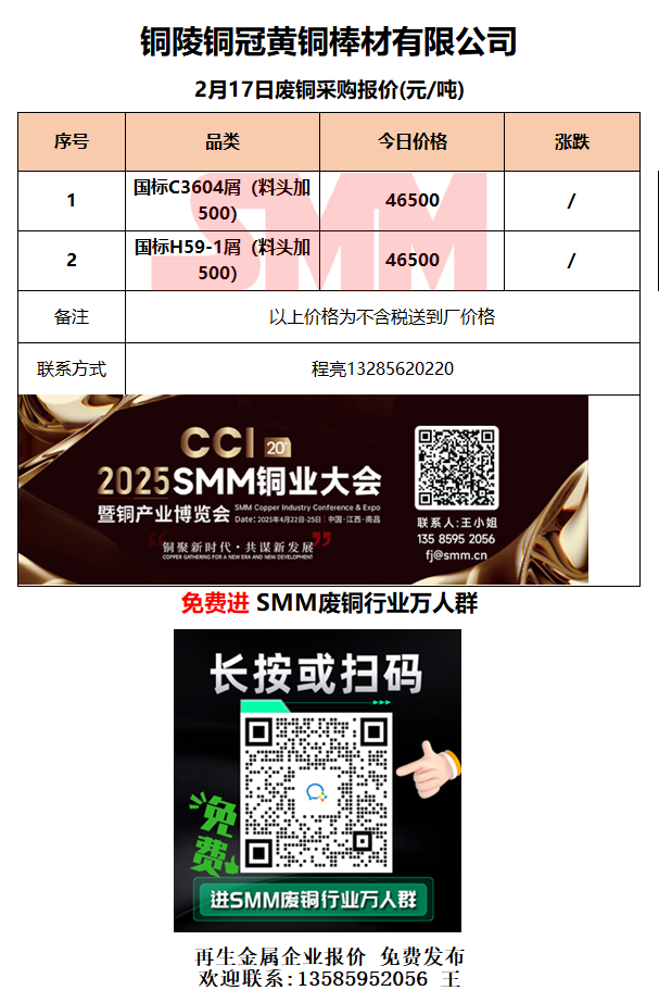2月17日铜陵铜冠 废铜采购报价