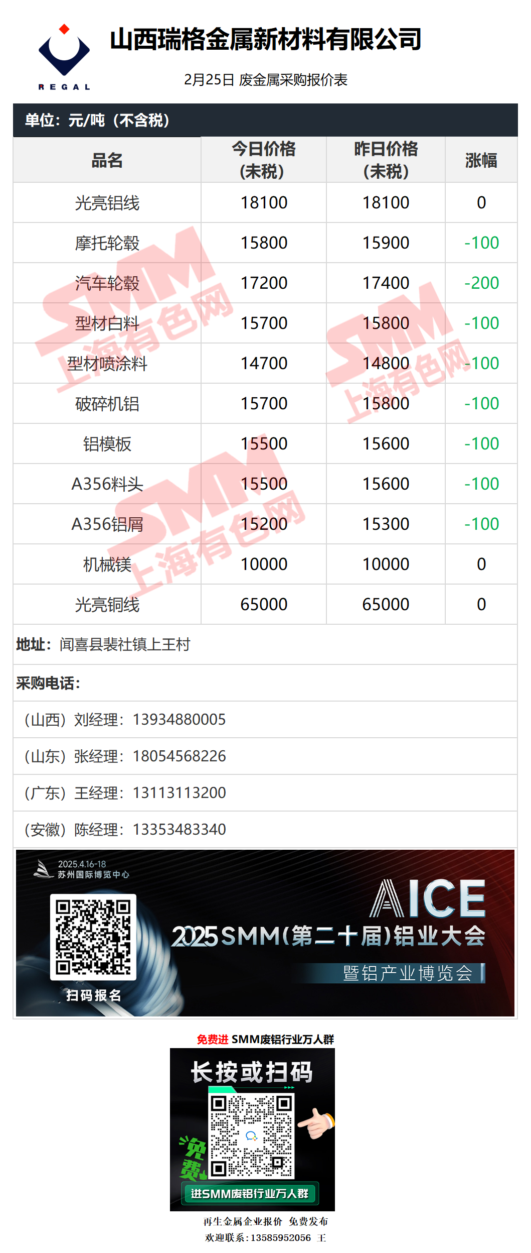 2月25日瑞格金属 废铝采购报价