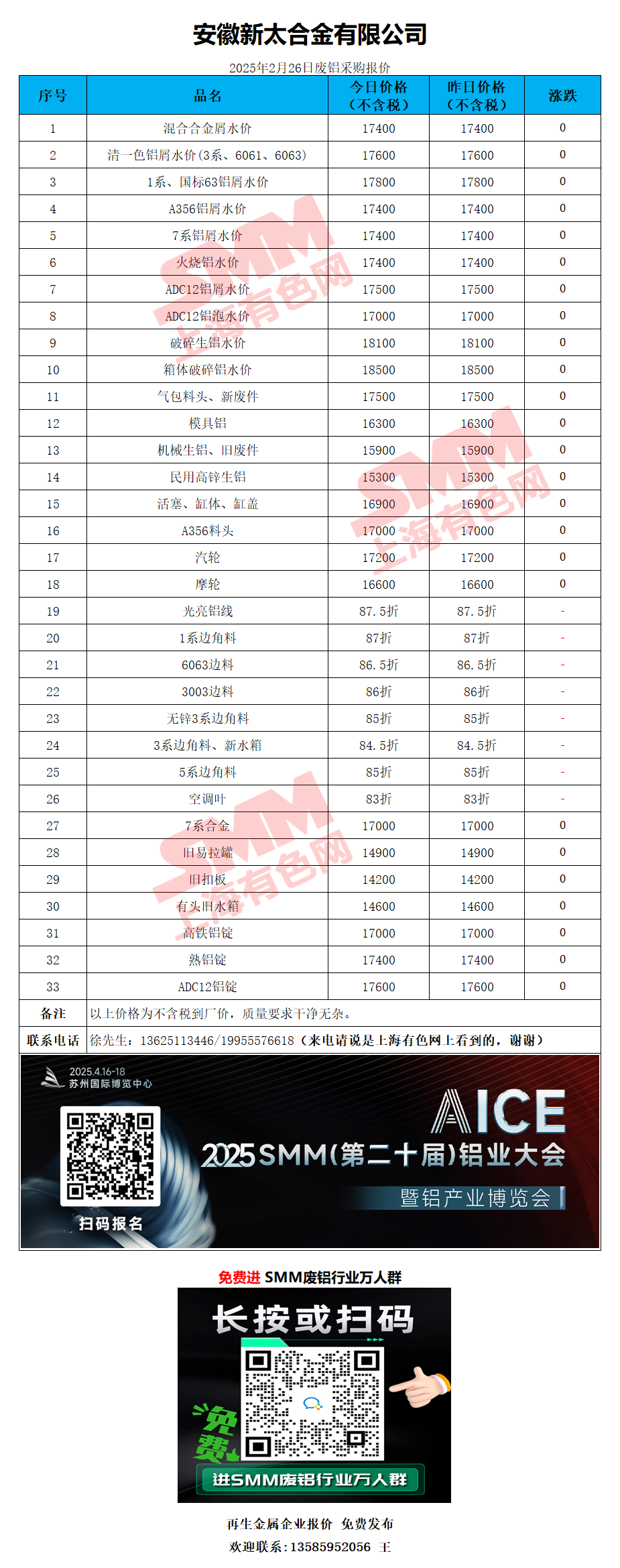 今日安徽新太 废铝采购报价已更新,有货的朋友欢迎联系我们!