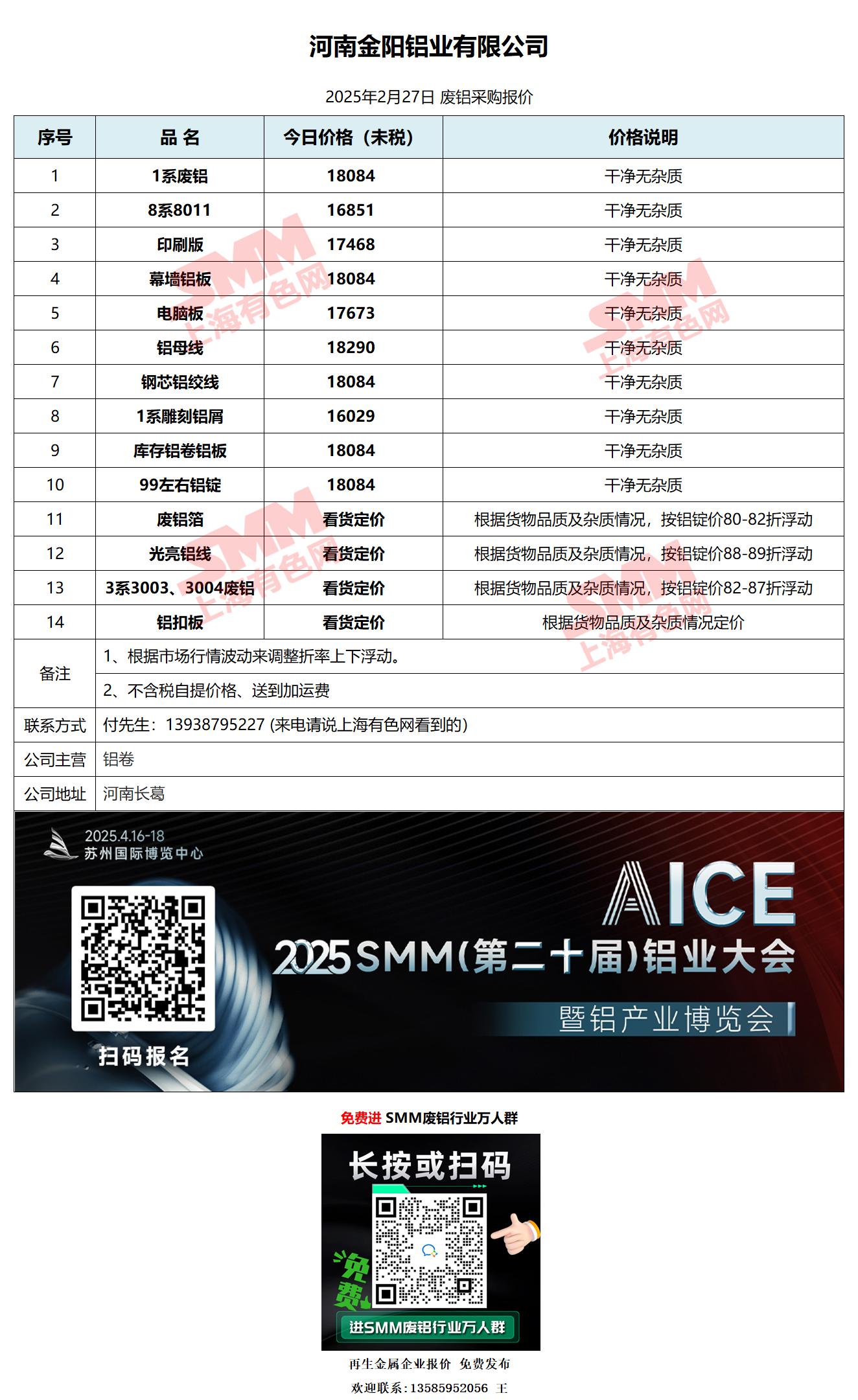 今日河南金阳铝业 废铝采购报价已更新,有货的朋友欢迎联系我们!