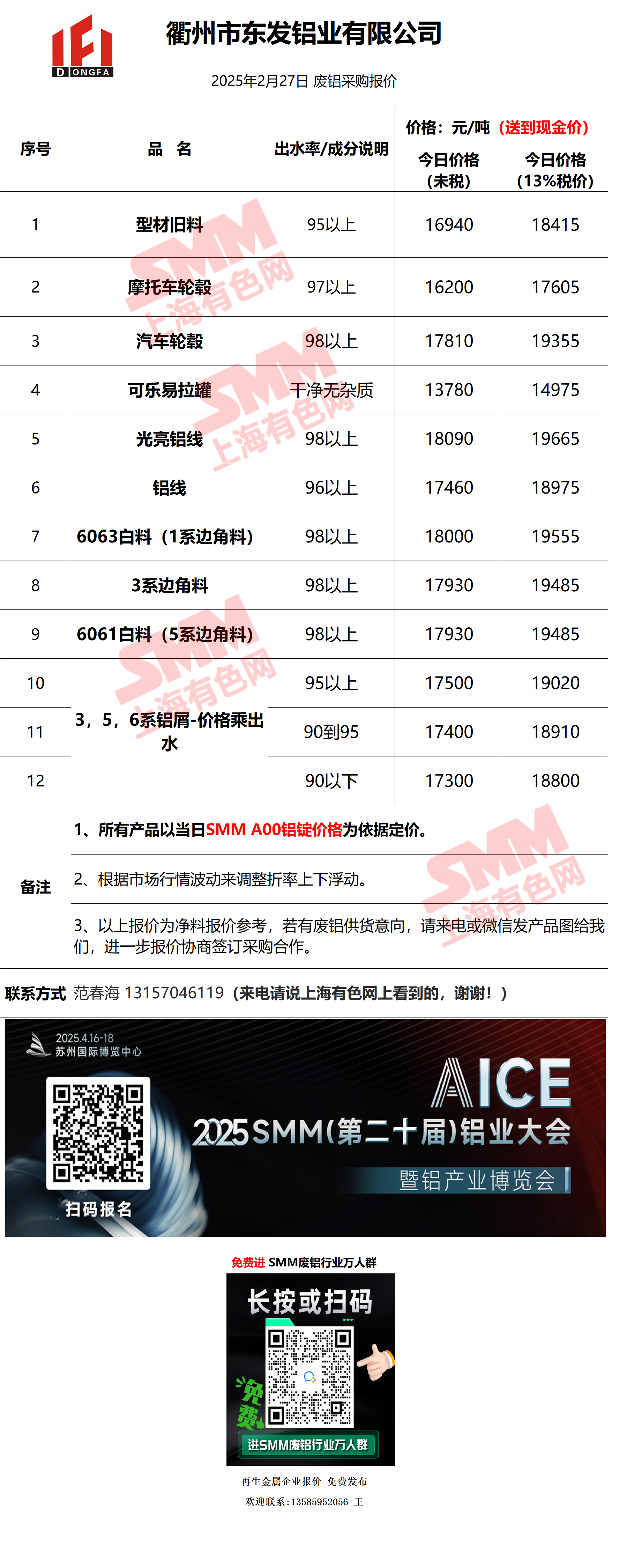 2月27日衢州东发 废铝采购报价