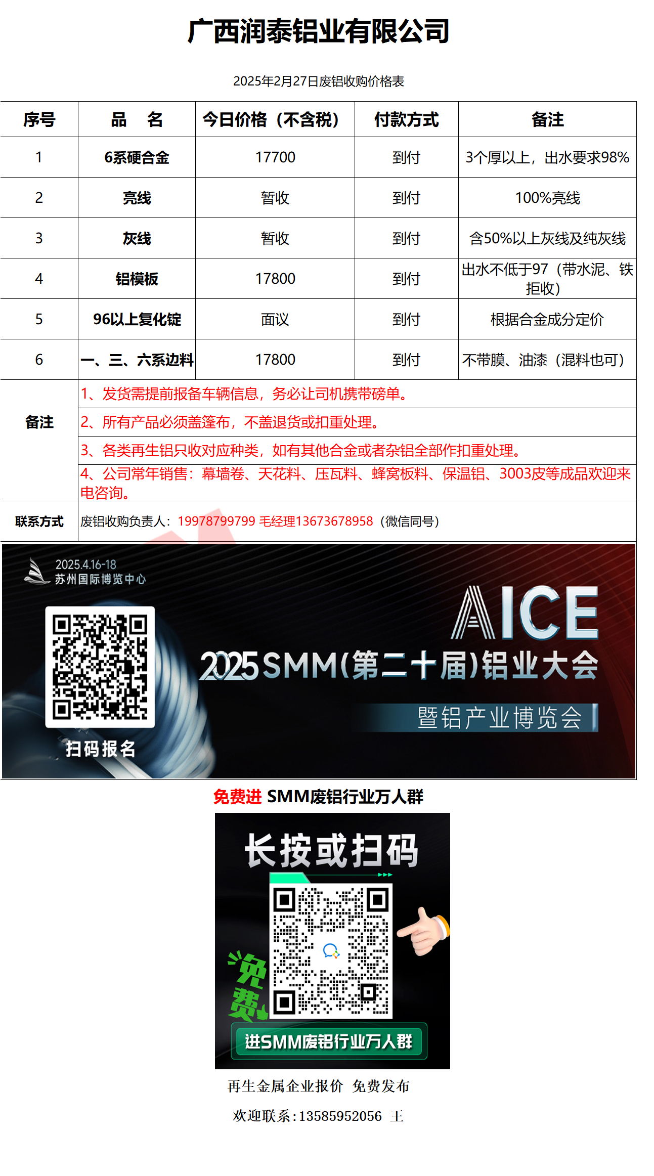 今日广西润泰铝业 废铝采购报价已更新,有货的朋友欢迎联系我们!