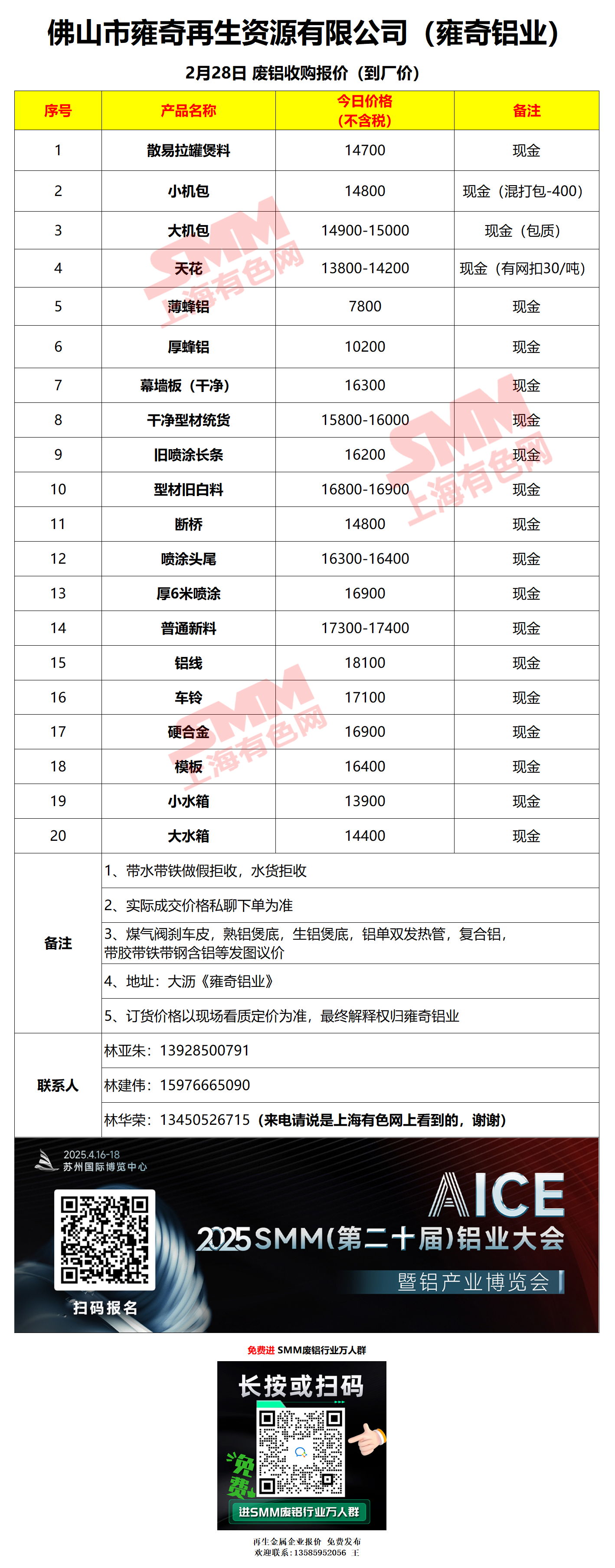 今日佛山雍奇 废铝采购报价已更新,有货的朋友欢迎联系我们!