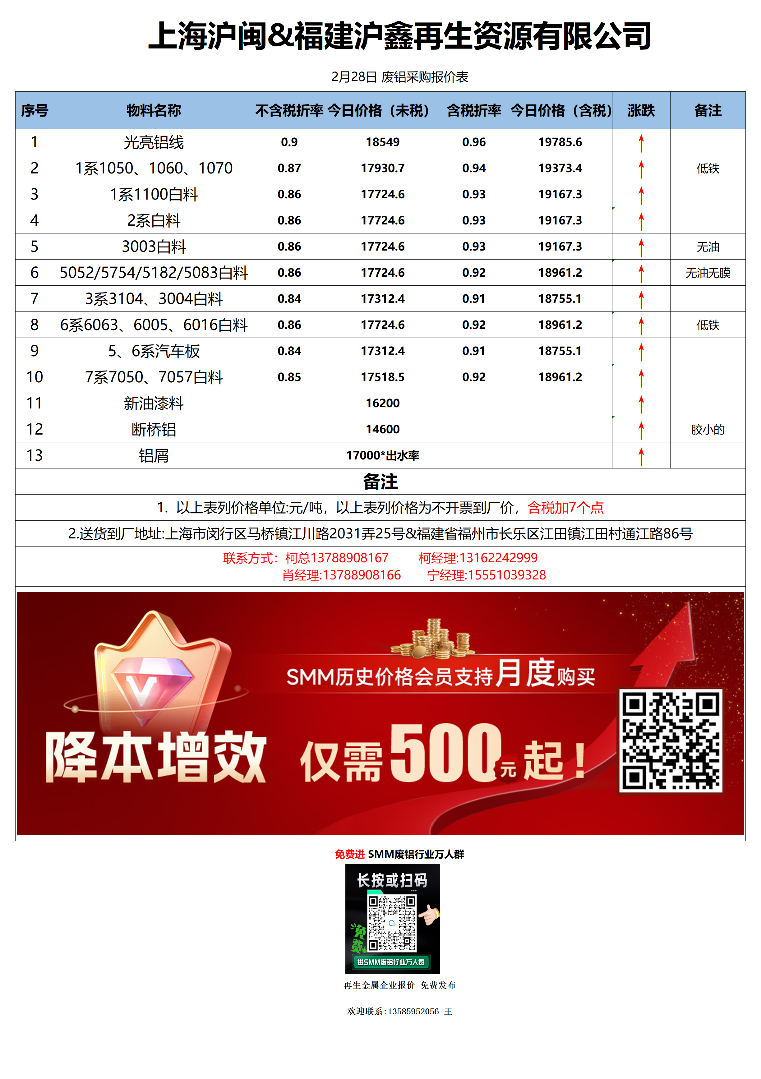 2月28日上海沪闽&福建沪鑫 废铝采购报价
