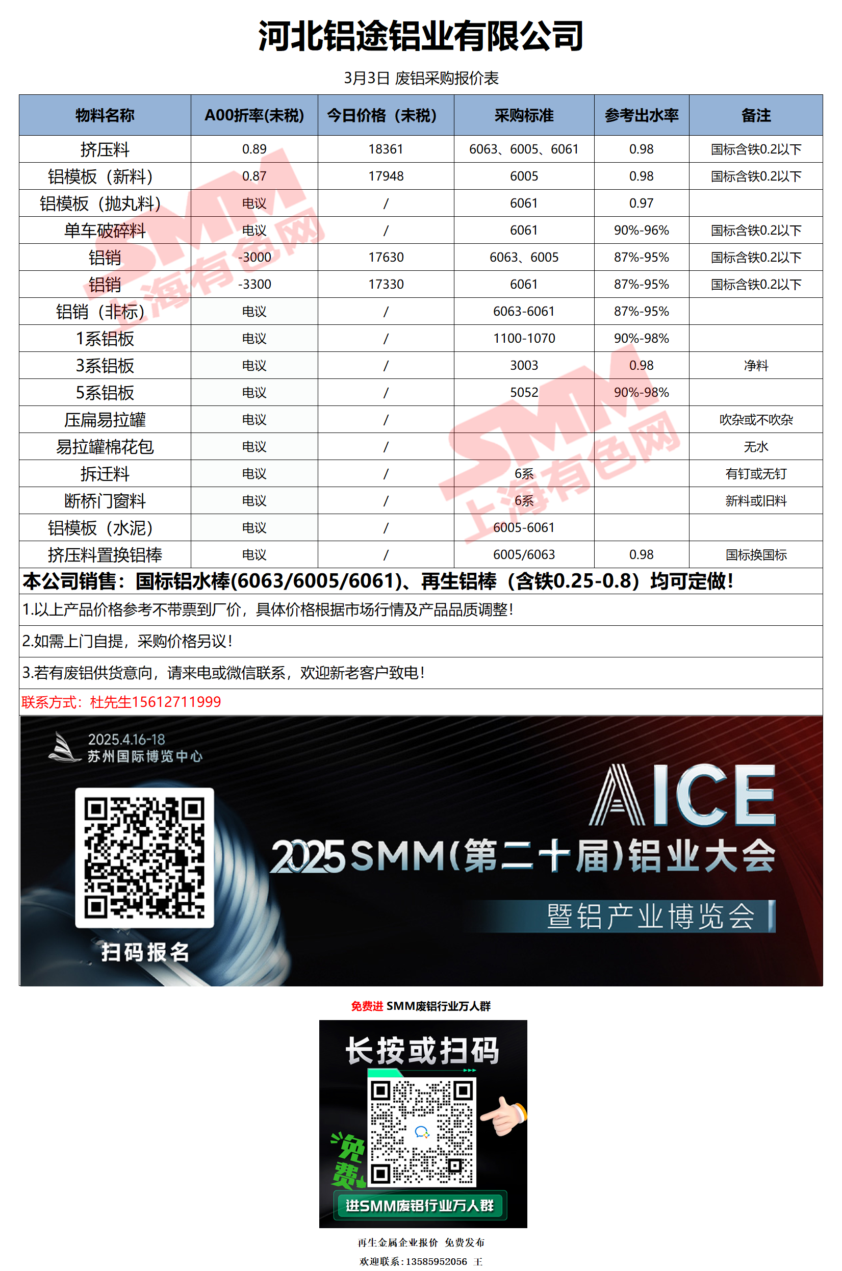 3月3日河北铝途 废铝采购报价