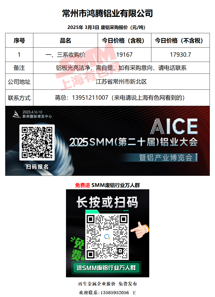 3月3日鸿腾铝业 废铝采购报价