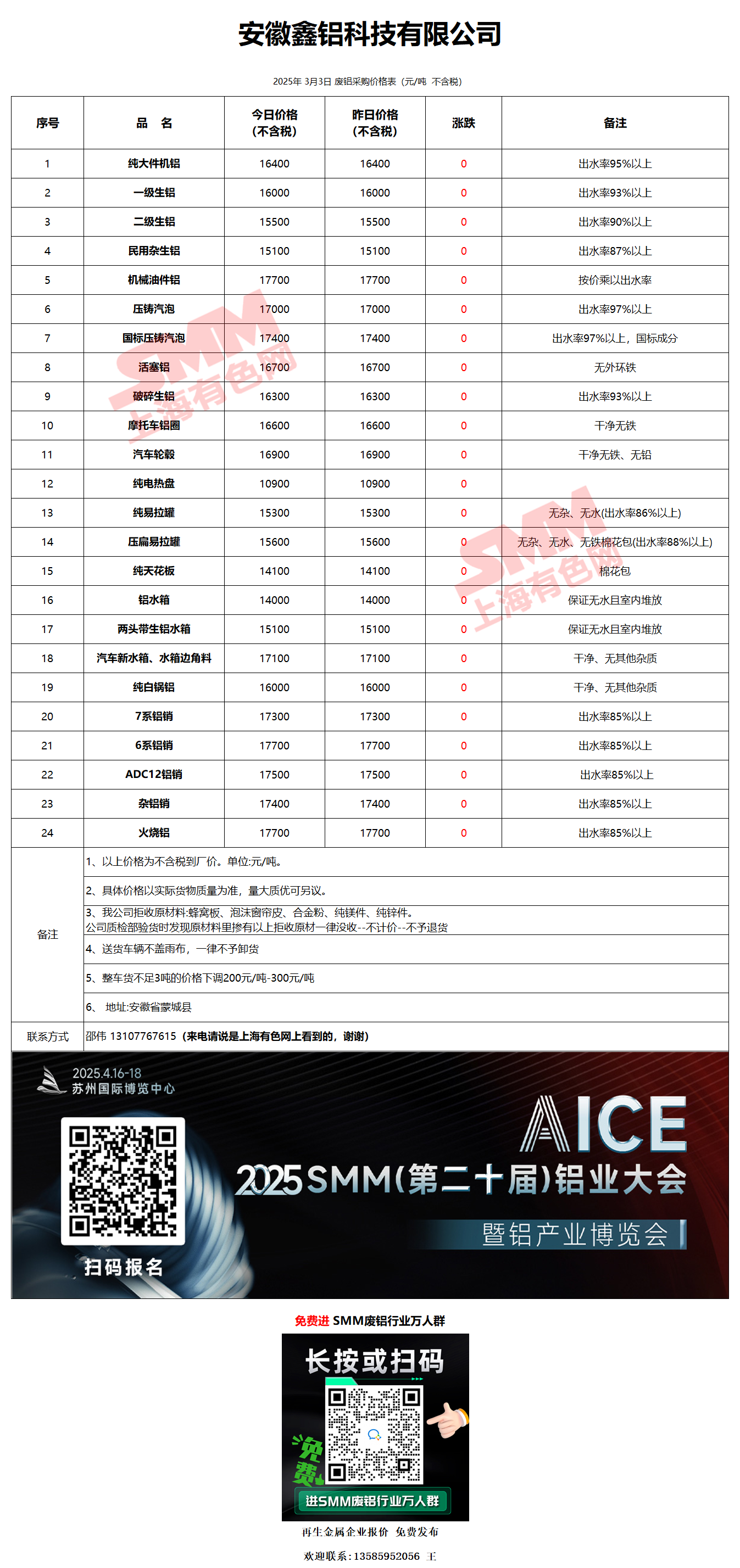 4月3日上海沪闽&福建沪鑫 废铝采购报价