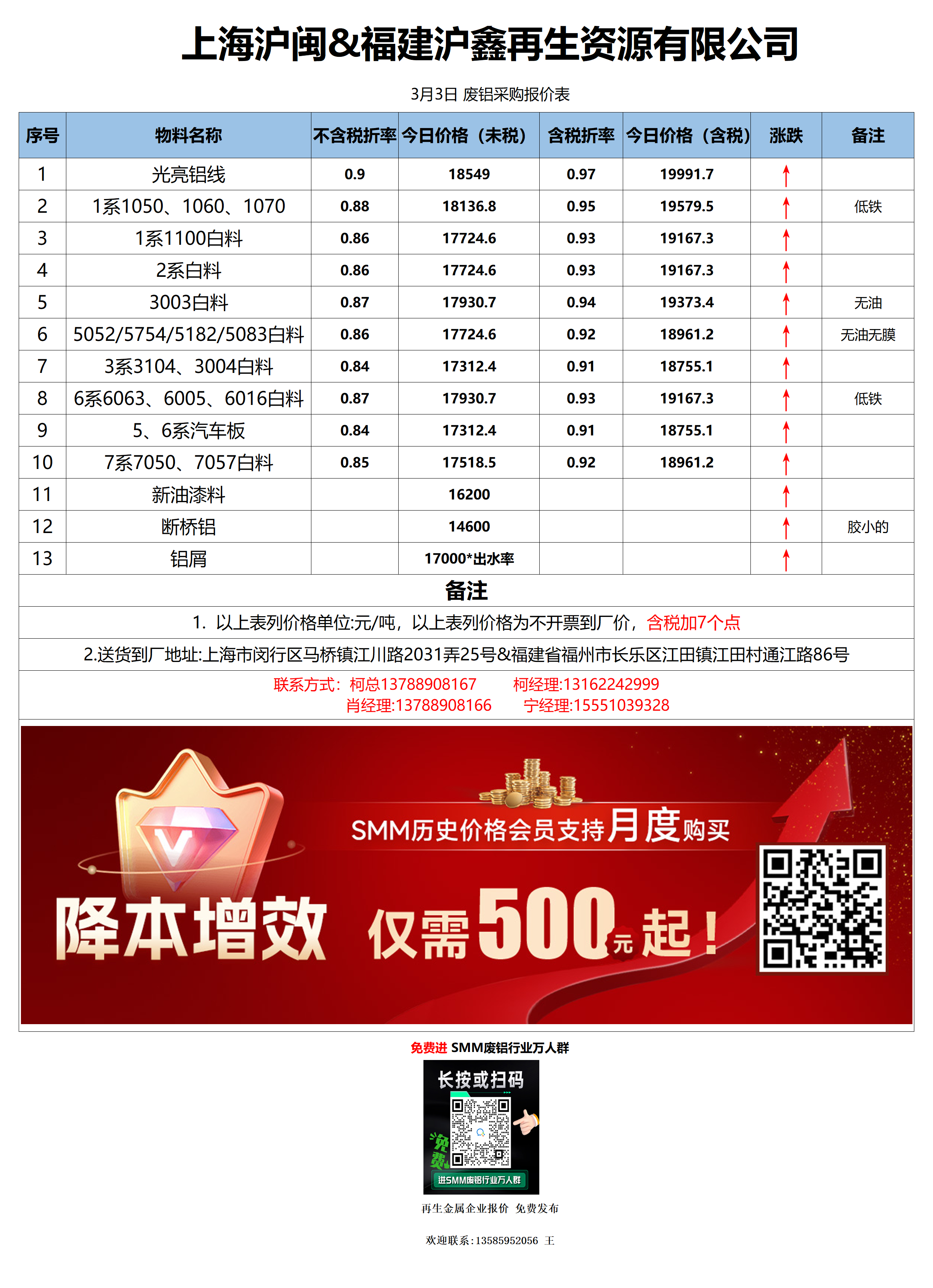 3月3日上海沪闽&福建沪鑫 废铝采购报价