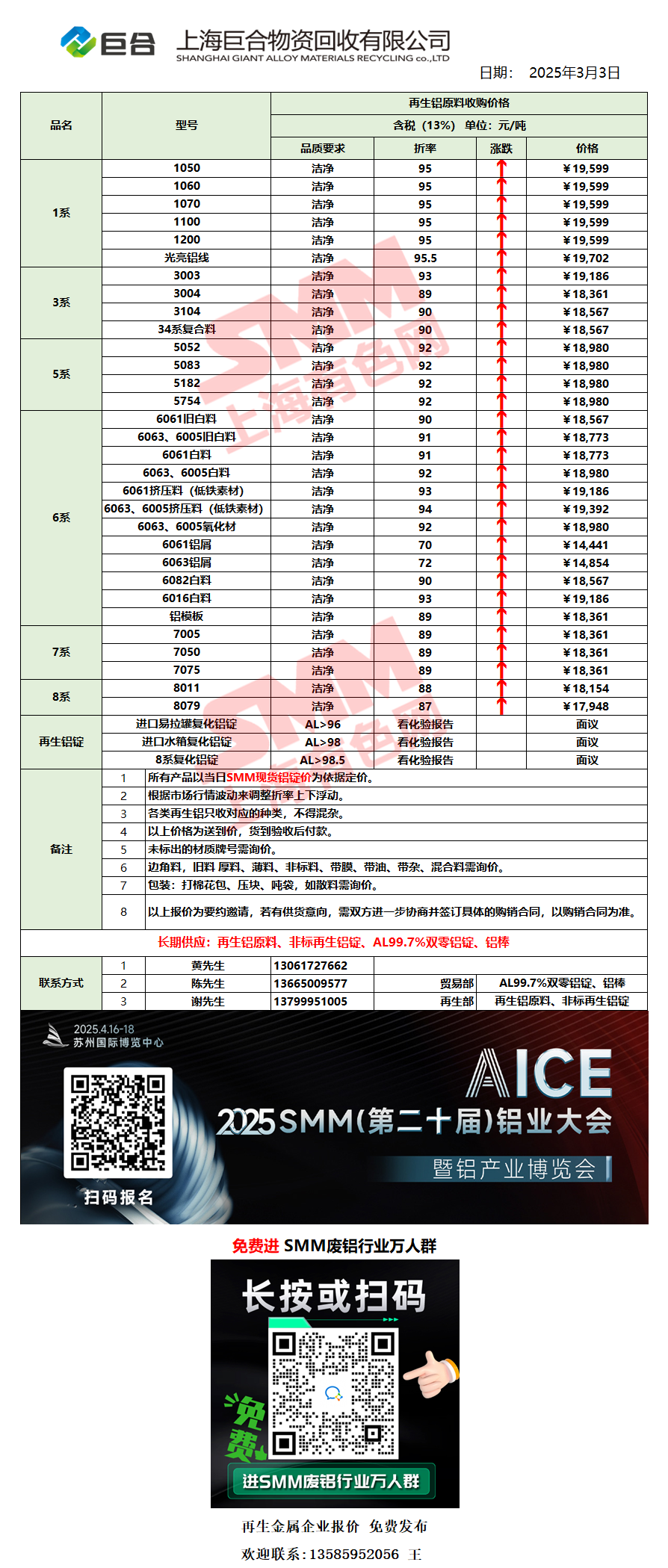 4月3日上海沪闽&福建沪鑫 废铝采购报价