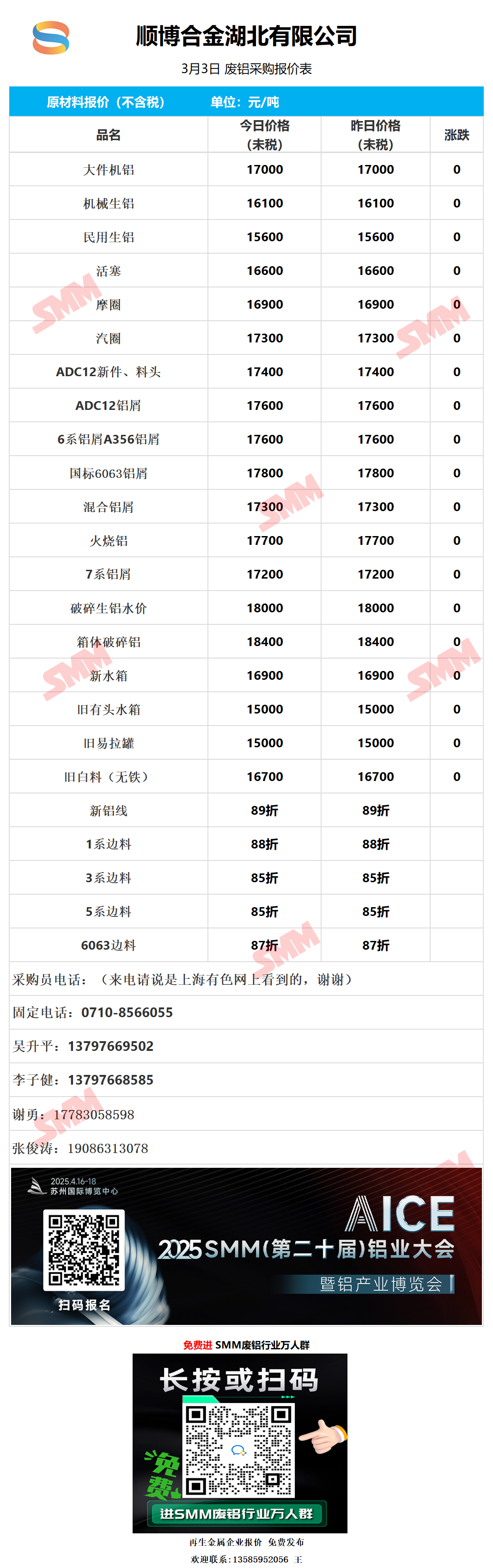 4月3日上海沪闽&福建沪鑫 废铝采购报价
