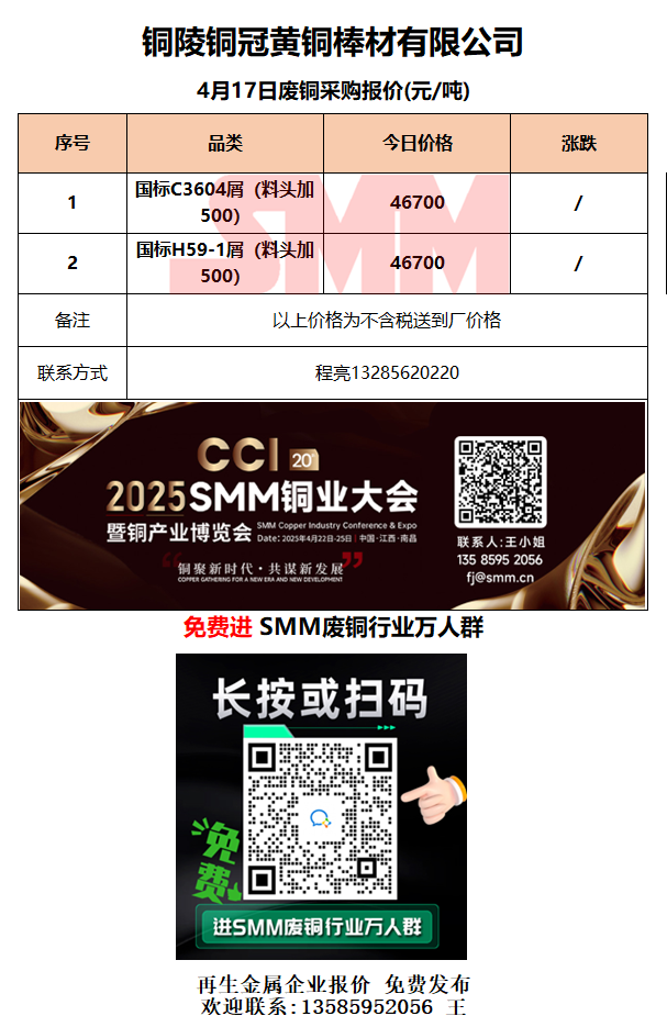 4月17日铜陵铜冠 废铜采购报价