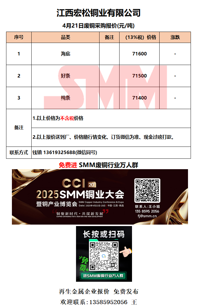 今日江西宏松 废铜采购报价已更新,有货的朋友欢迎联系我们!