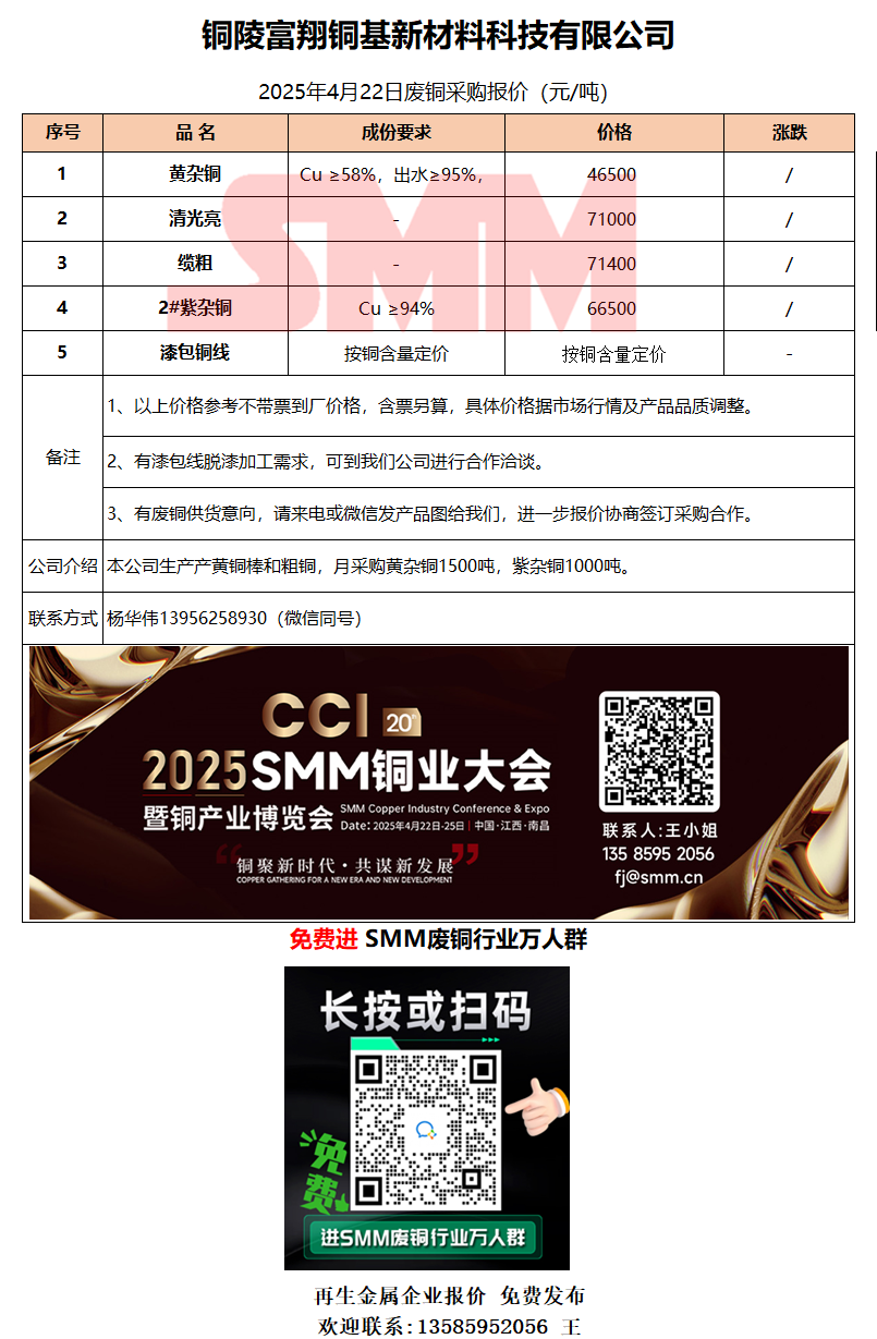 今日铜陵富翔 废铜采购报价已更新,有货的朋友欢迎联系我们!
