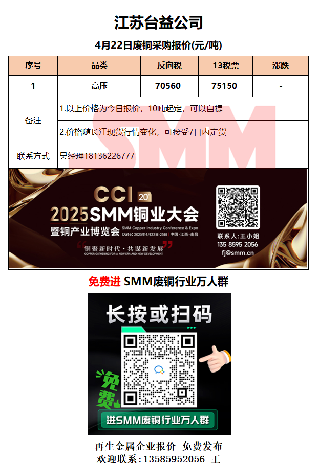 4月22日江苏台益 废铜采购报价