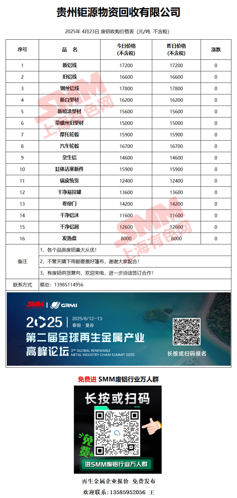4月23日贵州钜源 废铝采购报价