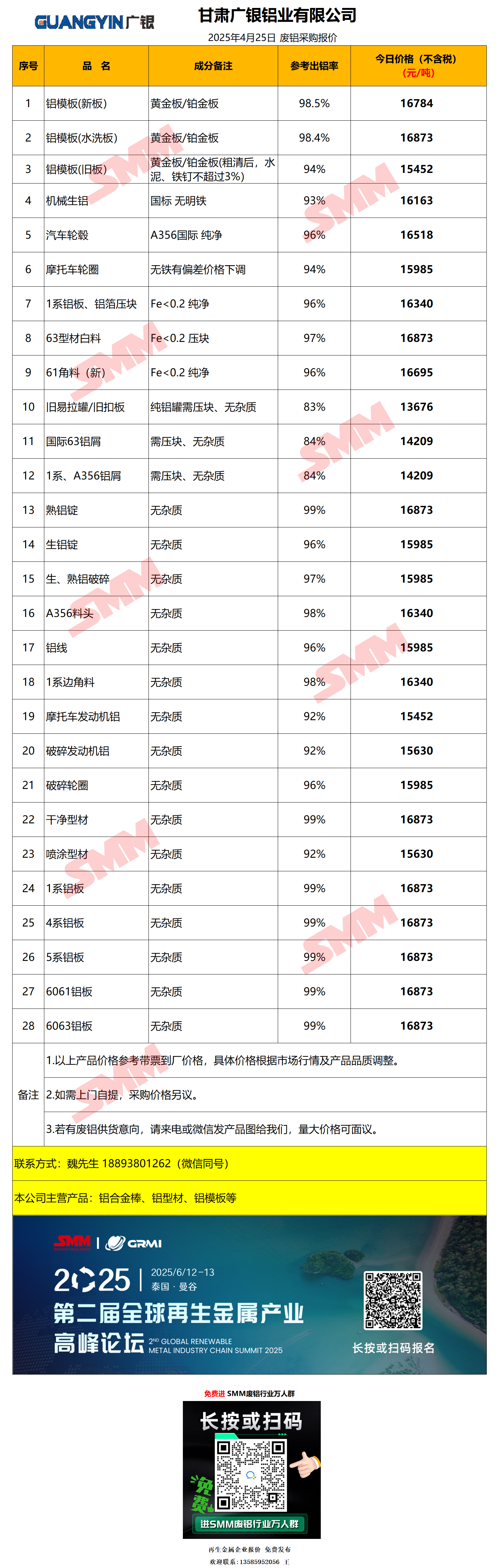 4月25日甘肃广银铝业 废铝采购报价